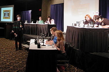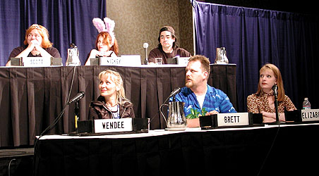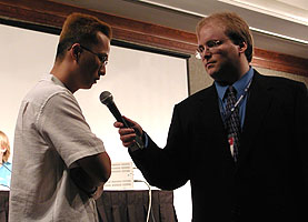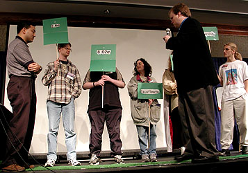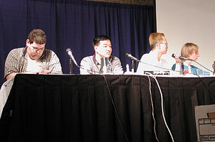 | The four contestants think carefully... good thing they didn't find themselves making errors on the Otaku Dating Game! | Ed "k1" Kwon climbs the mountain of cerebral insanity with some particularly difficult trivia questions given by Game Show Host Ryan Gavigan. |