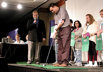 | Anime Trivia Game Show: Four select contestants, chosen for their brave skills, mad wits, and dutifully updated knowledge base on all that is anime, battled for the finish line in numerous wacky mind games to vie for top dog status. Who would be the Anime Trivia God? Shown above, Ernest Kim puts mecha stats in order and attempts to make a hole in one on the putting green from his most correct answer. | |