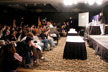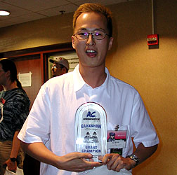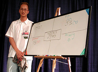 | And the crowd goes wild as the winners and runners-up are announced and free merchandise is given away, thanks to the Anime Central sponsors. | Ed poses proudly next to the scoreboard. Girls, this ain't no regular otaku; this here's a rare species with bishounen looks to swoon for! |