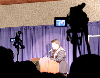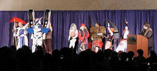| ...Escaflowne Lost and Found, Utena characters, Captain Harlock, another Great Saiyaman, Sailor Moon + Belldandy, Cosplay Cuties ChamChams, Mecha Godzilla, Not Ready for Bandai Players, Pretty Sammy, Turning Japanese with Tenchi Muyou!, more characters from Tokyo Babylon, Utena, Card Captor Sakura, and Chrono Cross, Violinist of Hamlin, Resident Evil, Legato from Trigun, Ode to Otaku with PockyGirl, MIss Anime Girl (Got Pocky?), Wolfwood from Trigun, Setsuna from Last Blade II, Ohja Mahou Doremi, Record of Lodoss War, Captain Tylor, Menshi from Excel Saga, Final Fantasy 7, Dancin' Acen 2K1, Nostalgia Streets of Rage, Nighttime Lain Tournament, Pretty Linna's Magical Sailor Introduction, Black Lady from Sailor Moon Stars, The Real Vash from Trigun, Trigun + Shampoo, and Rurouni Kenshin. Chants for the night squelched out the old outdated "Chair!" and welcomed in "Dance!", "Pocky!", and of course, "Love and Peace!" from Trigun. Don't forget to check out the Cosplay Contest Winners Circle! | |