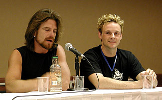| Above and below: Scott McNeil and Kirby Morrow: Inside the Voice Actor Studio: Scott McNeil (left) and Kirby Morrow (right) spoke for a packed audience about their very active vocal work. With such credits like He-Man and GiJoe behind them, they reiterated that voice acting is the purist form of acting and being able to be recognized based on voice is an honor. Topics and subjects covered the physical parts of voice acting by moving hands and body around to enhance a voice for a particular scene, doing cultural research to properly fit a character, and announcing new anime projects for fans to look forward to. Highlights also included Scott's impersonations of Christoher Lloyd, Chris Walken, and a Scottish character from his stint on Highlander as well as funny moments about the Ranma insanity in which he was able to voice several characters with wacky results. | |