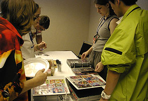 | Trading Card Gathering: Held again for the hungry fans who probably spent too much in the dealers room, it's not enough to have just a few; you gotta collect more! And when you come to a convention, for some fans, this was the place to trade some cards around to get an upper hand towards strengthening your card collection. | Lost in the Translation: Popular Japanese translators (left to right) Neil Nadelman, Dave Fleming, and Dan Kanemitsu gave insightful views on the hard work behind Japanese translation efforts. Topics covered learning from popular culture and historical material, use of military and slang dictionaries, and essential illustrative dictionaries. |