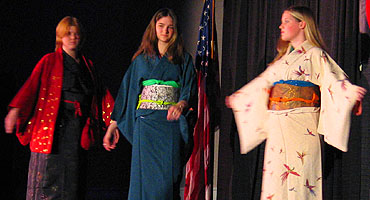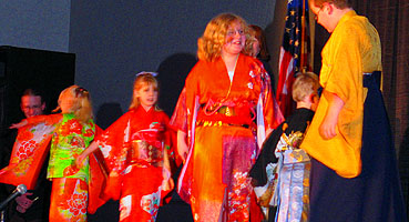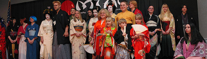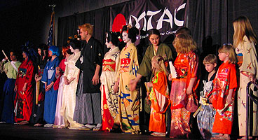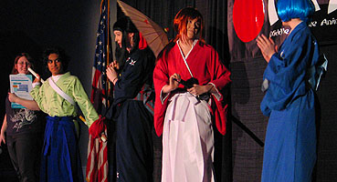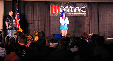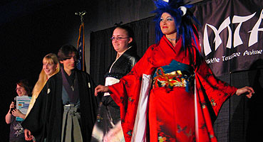 an amazing collection of tunes from her latest album. Next up, the big Anime Music Video Contest saw the usual big line forming early in the afternoon, everyone knows it's all about anime excitement and love for the music. And finally, the big Cosplay Contest for Saturday evening filled up all of the seats with lots of great entries with everything from Pokemon to Naruto, Final Fantasy to Full Metal Alchemist, and Sailor Moon to Suikoden. The results are in, so here we go: Middle Tennessee Anime Convention 2005 Anime Music Video Contest Awards Judges Choice Award: "Only Tokyo" with clips from Only Yesterday Judges Choice Award and Audience Choice Award: "Vash the Desperado" with clips from Trigun Judges Choice Award: "Dreams Come True" Best Comedy Award: "Nature Trail to Hell" Best Drama Award: "Lift Me Up" with clips from Fushigi Yugi Best Non-Music Video Award: "Outlaws of the Caribbean" with clips from Outlaw Star Technical Merit Award: "Am I Awake?" with clips from Urusei Yatsura Judges Special Achievement Award: "Very Bootiful Christmas" with clips from various anime Best Action and Best of Show Award: "Let the Bodies Hit the Floor" with clips from Naruto Middle Tennessee Anime Convention 2005 Cosplay Contest Awards Best Child Award: Sailor Mars Children's Honorable Mention Award: Shuichi from Gravitation Children's Honorable Mention Award: Blue Link from Zelda Children's Honorable Mention Award: Pichu from Pokemon Best Novice Skit Award: Metal Gear Solid group Novice Craftsmanship Award: Warrior Paine from FFX-2 Novice Recreation Award: Prince from Katamari Damacy Best Novice Presentation Award: Phantom Thief Gackt Intermediate Recreation Award: Miroku from Inuyasha Intermediate Skit Award: Puppets Intermediate Craftsmanship Award: Rose Bride from Utena Intermediate Presentation Award: Naruto group Advanced Recreation Award: Kagoye Advanced Presentation Award: Great Saiyaman from Dragonball Z Advanced Skit Award: Price of Life with characters from Full Metal Alchemist Best Original Cosplay Award: Pokemaniac Staff Favorite Award: Zellos from Slayers Judges Choice Award: Belldandy from Ah! My Goddess Best Obscure Cosplay Award: Princess Kagyuyu from Inuyasha the Movie Hot Crossovers Award: Sanza from Saiyuki Big Hat Award: Ghost Best Hardware Award: Edea from FF8 Judges Choice Award: Mario 2K5 Judges Choice Award: Chidori Kaname from Full Metal Panic Best of Show Award: Price of Life with characters from Full Metal Alchemist |