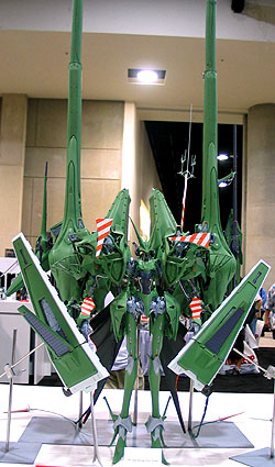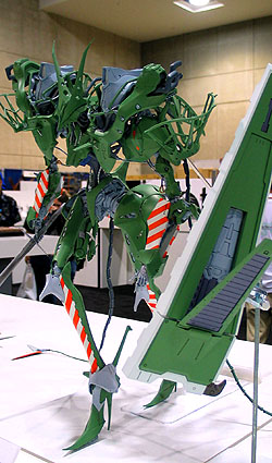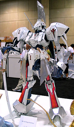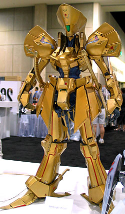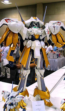 Art Exhibitions are the key vehicles of inspiration for artists and modelers alike, but one amazing spectacle that was a definite must-see was the Five Star Stories model exhibition booth located in the Dealers Hall for 2003.  Huge scaled build kits towered on tables for everyone to see.  From the popular LED Mirage to the fabulous Knight of Gold, this was a one-of-a-kind opportunity to enjoy Five Star Stories creator Mamoru Nagano's splendid works in full model form and function!